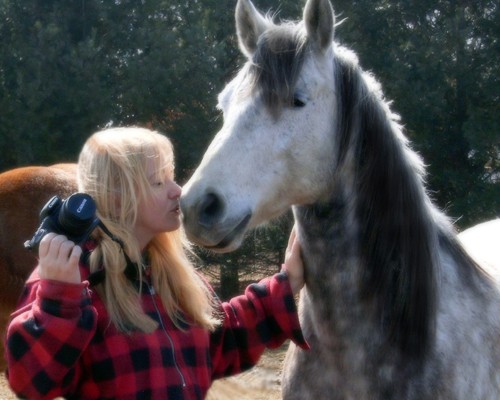 picture to the left of Karen with her horse Josh on a typical day in the pasture